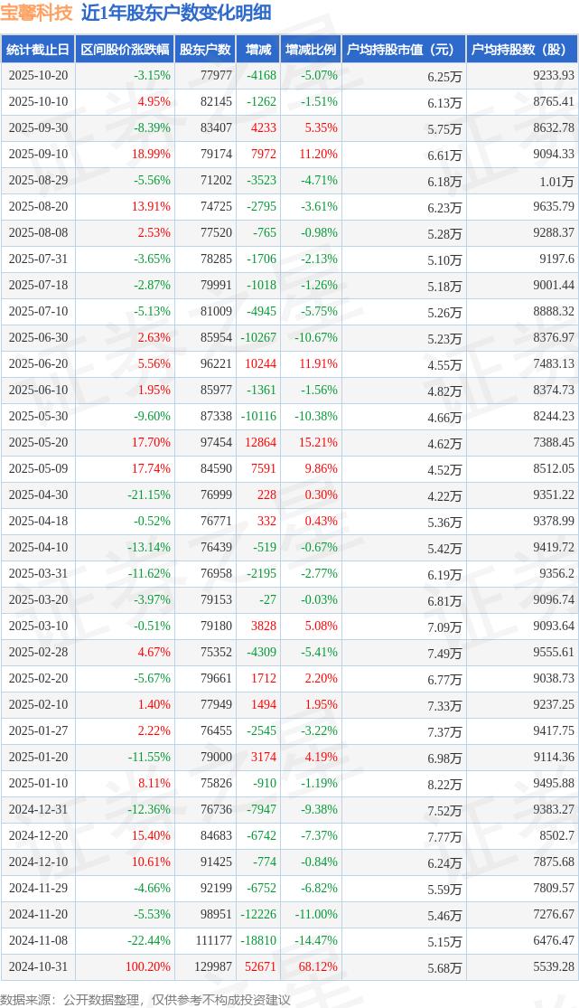 从股价来看,2025年10月10日至2025年10月20日,宝馨科技区间跌幅为3.15%,在此期间股东户数减少4168.0户,减幅为5.07%。
