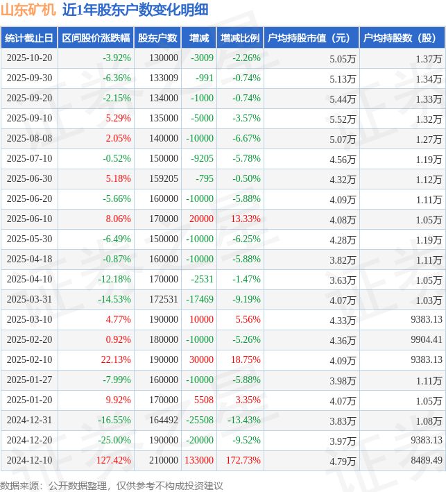 从股价来看,2025年9月30日至2025年10月20日,山东矿机区间跌幅为3.92%,在此期间股东户数减少3009.0户,减幅为2.26%。