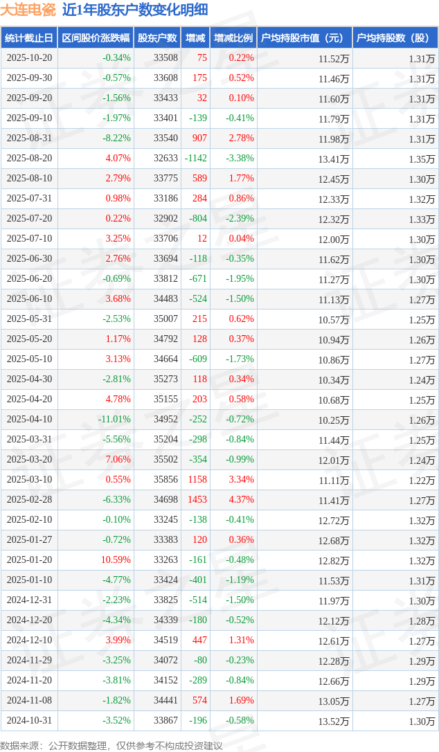 从股价来看,2025年9月20日至2025年10月20日,大连电瓷区间跌幅为0.34%,在此期间股东户数增加75.0户,增幅为0.22%。