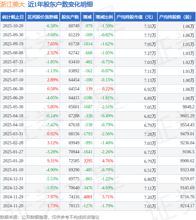 从股价来看,2025年9月19日至2025年10月20日,浙江美大区间跌幅为6.58%,在此期间股东户数减少979.0户,减幅为1.59%。