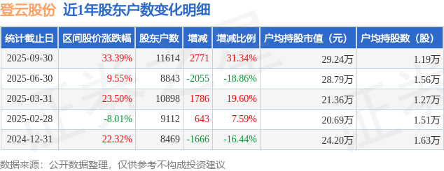 从股价来看,2025年6月30日至2025年9月30日,登云股份区间涨幅为33.39%,在此期间股东户数增加2771.0户,增幅为31.34%。