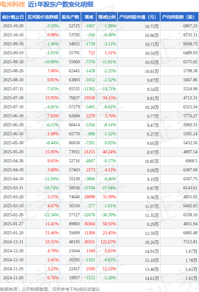 从股价来看,2025年10月10日至2025年10月20日,电光科技区间跌幅为3.1%,在此期间股东户数减少1067.0户,减幅为1.98%。