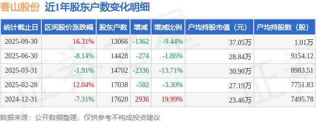 从股价来看,2025年6月30日至2025年9月30日,香山股份区间涨幅为16.31%,在此期间股东户数减少1362.0户,减幅为9.44%。