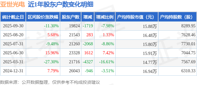 从股价来看,2025年8月20日至2025年9月30日,亚世光电区间跌幅为11.3%,在此期间股东户数减少1719.0户,减幅为7.98%。