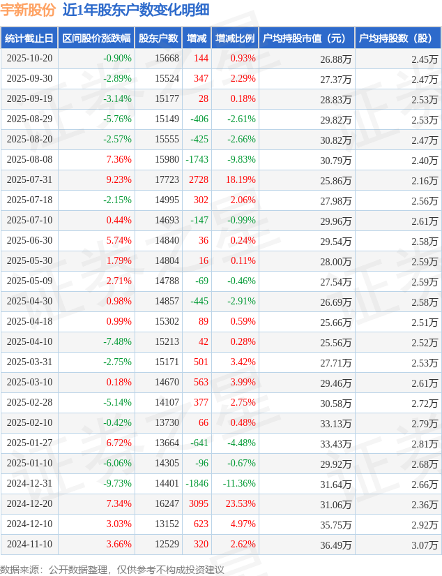 从股价来看,2025年9月30日至2025年10月20日,宇新股份区间跌幅为0.9%,在此期间股东户数增加144.0户,增幅为0.93%。