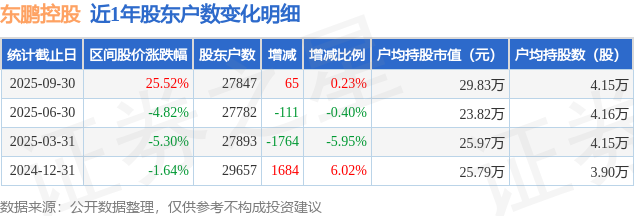 证券之星消息,近日东鹏控股披露,截至2025年9月30日公司股东户数为2.78万户,较6月30日增加65.0户,增幅为0.23%。户均持股数量由上期的4.16万股减少至4.15万股,户均持股市值为29.83万元。