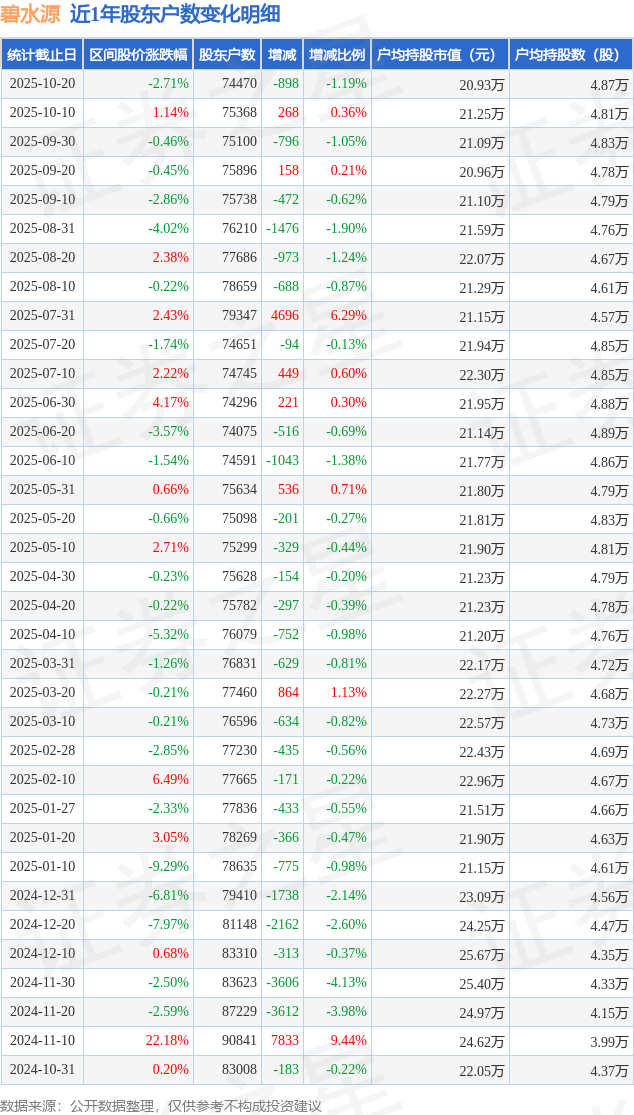 从股价来看,2025年10月10日至2025年10月20日,碧水源区间跌幅为2.71%,在此期间股东户数减少898.0户,减幅为1.19%。