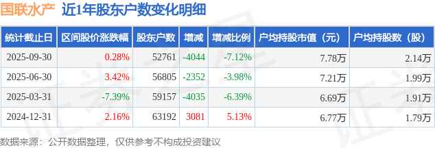 从股价来看,2025年6月30日至2025年9月30日,国联水产区间涨幅为0.28%,在此期间股东户数减少4044.0户,减幅为7.12%。