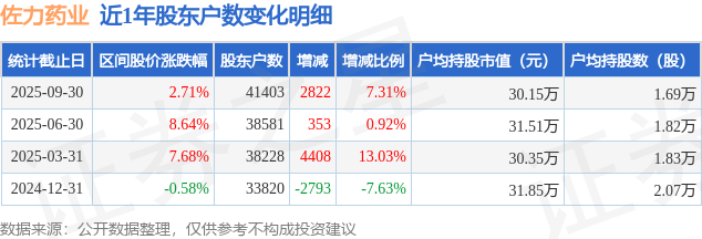 从股价来看,2025年6月30日至2025年9月30日,佐力药业区间涨幅为2.71%,在此期间股东户数增加2822.0户,增幅为7.31%。