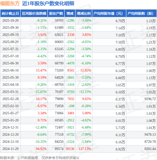 从股价来看,2025年9月30日至2025年10月20日,福能东方区间跌幅为8.31%,在此期间股东户数减少2286.0户,减幅为3.69%。