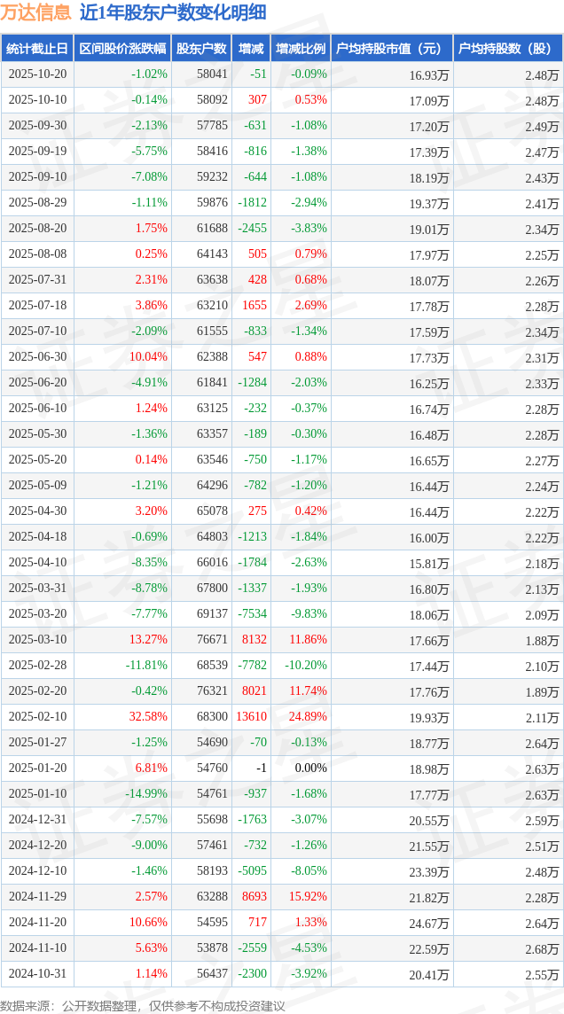 从股价来看,2025年10月10日至2025年10月20日,万达信息区间跌幅为1.02%,在此期间股东户数减少51.0户,减幅为0.09%。