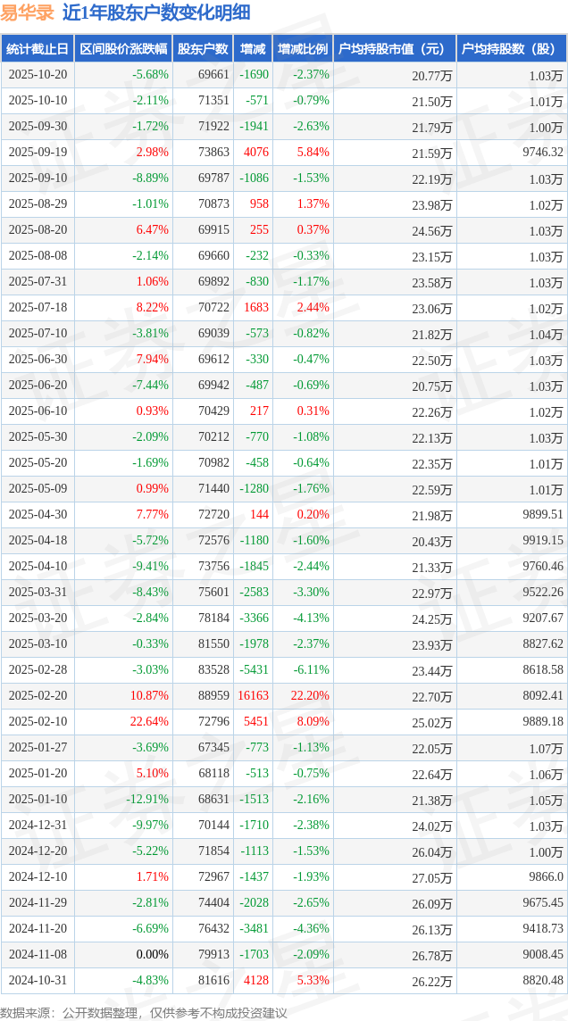 从股价来看,2025年10月10日至2025年10月20日,易华录区间跌幅为5.68%,在此期间股东户数减少1690.0户,减幅为2.37%。