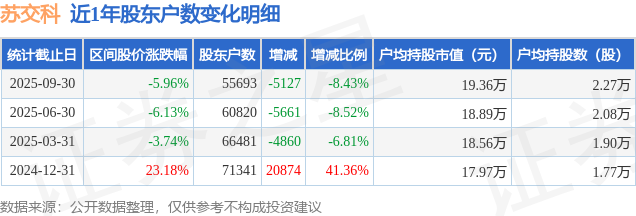 证券之星消息,近日苏交科披露,截至2025年9月30日公司股东户数为5.57万户,较6月30日减少5127.0户,减幅为8.43%。户均持股数量由上期的2.08万股增加至2.27万股,户均持股市值为19.36万元。