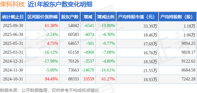 从股价来看,2025年6月30日至2025年9月30日,荣科科技区间涨幅为61.38%,在此期间股东户数减少6541.0户,减幅为10.8%。