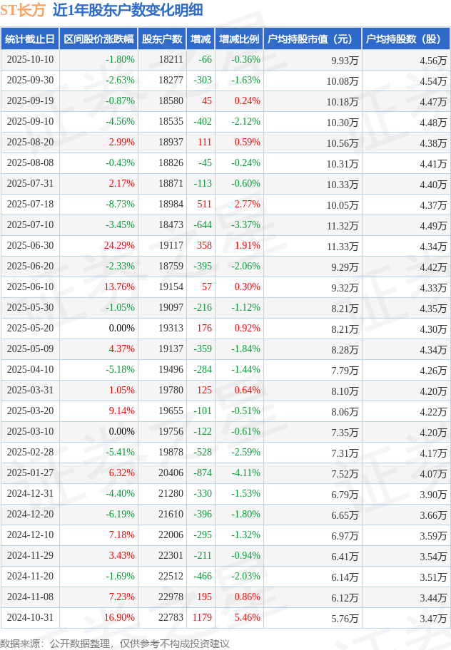 从股价来看,2025年9月30日至2025年10月10日,ST长方区间跌幅为1.8%,在此期间股东户数减少66.0户,减幅为0.36%。