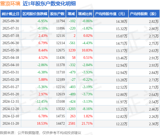 从股价来看,2025年7月31日至2025年9月30日,雪浪环境区间跌幅为6.95%,在此期间股东户数减少102.0户,减幅为0.86%。