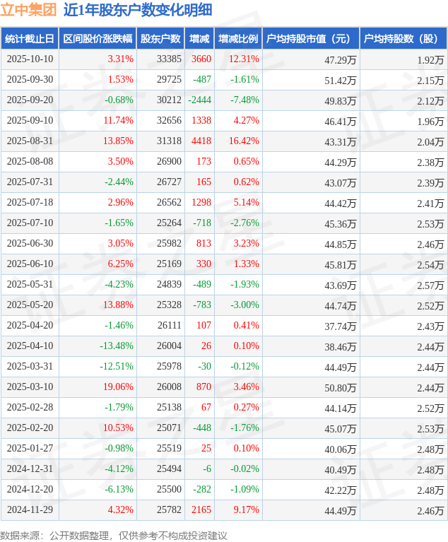 从股价来看,2025年9月30日至2025年10月10日,立中集团区间涨幅为3.31%,在此期间股东户数增加3660.0户,增幅为12.31%。