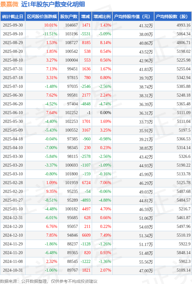 从股价来看,2025年9月10日至2025年9月30日,景嘉微区间涨幅为10.01%,在此期间股东户数增加1471.0户,增幅为1.43%。