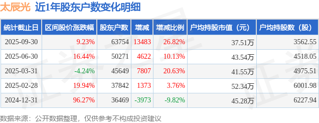 从股价来看,2025年6月30日至2025年9月30日,太辰光区间涨幅为9.23%,在此期间股东户数增加1.35万户,增幅为26.82%。