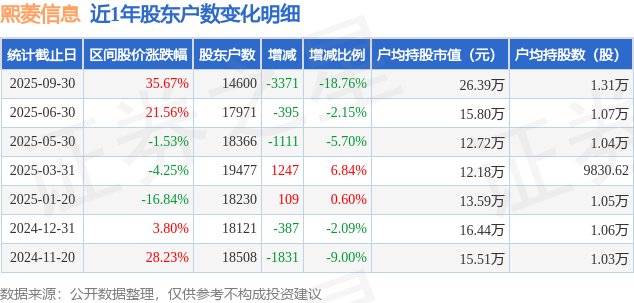 从股价来看,2025年6月30日至2025年9月30日,熙菱信息区间涨幅为35.67%,在此期间股东户数减少3371.0户,减幅为18.76%。