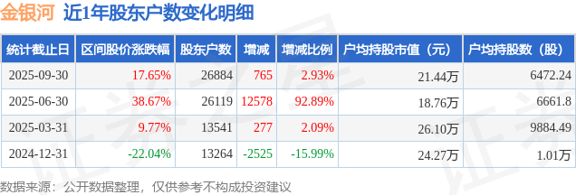 从股价来看,2025年6月30日至2025年9月30日,金银河区间涨幅为17.65%,在此期间股东户数增加765.0户,增幅为2.93%。