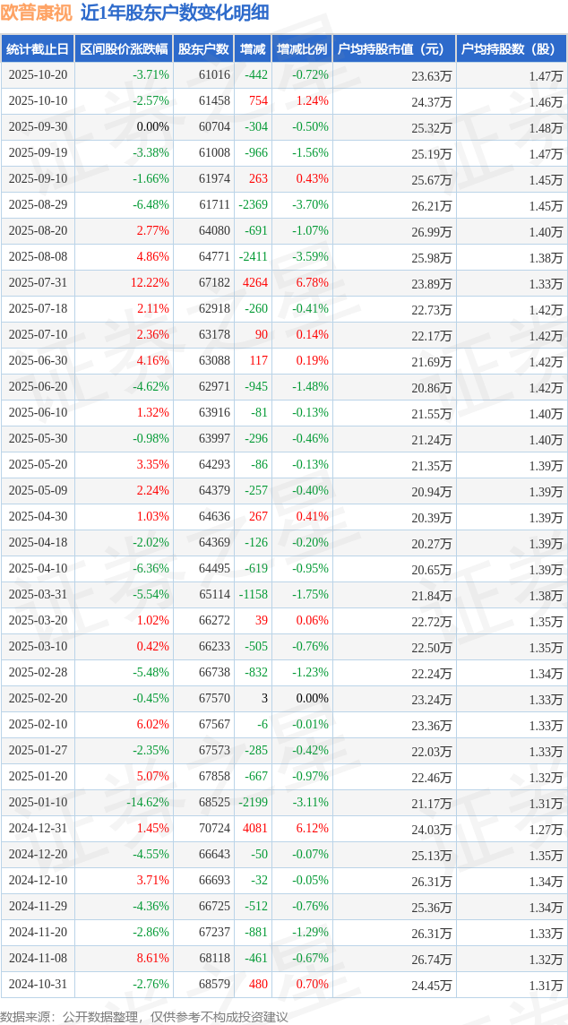 从股价来看,2025年10月10日至2025年10月20日,欧普康视区间跌幅为3.71%,在此期间股东户数减少442.0户,减幅为0.72%。