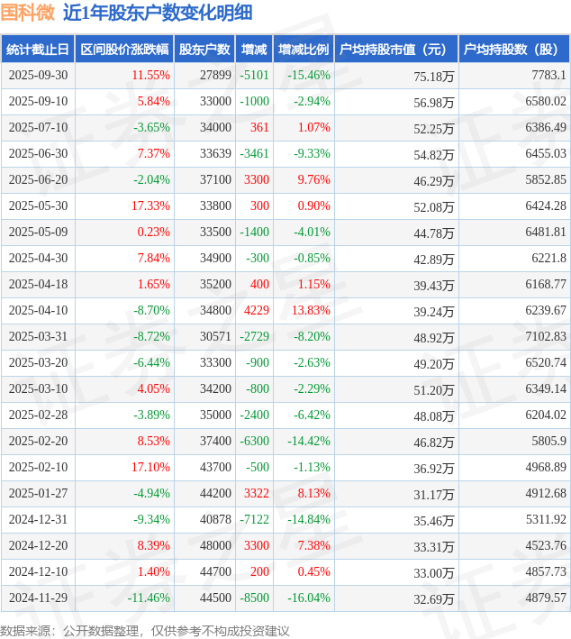 从股价来看,2025年9月10日至2025年9月30日,国科微区间涨幅为11.55%,在此期间股东户数减少5101.0户,减幅为15.46%。