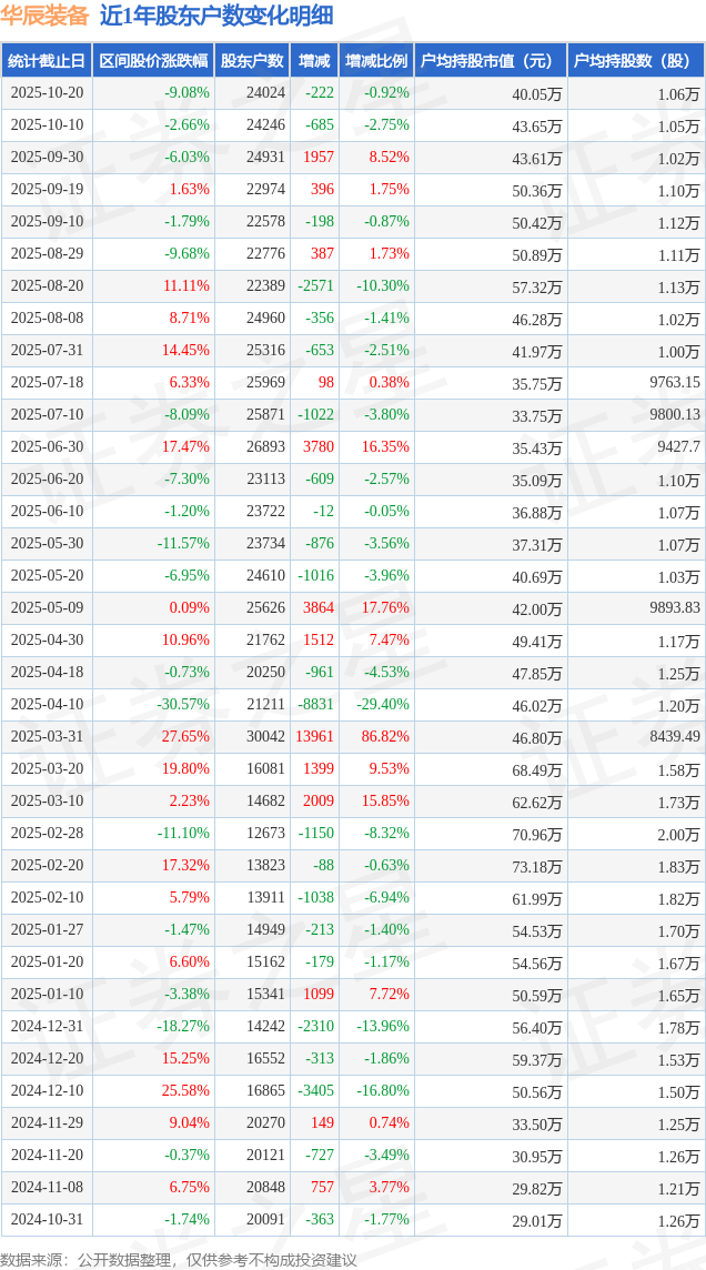从股价来看,2025年10月10日至2025年10月20日,华辰装备区间跌幅为9.08%,在此期间股东户数减少222.0户,减幅为0.92%。