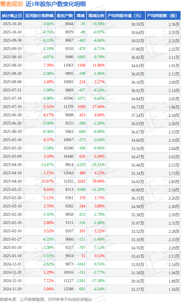 从股价来看,2025年10月10日至2025年10月20日,蕾奥规划区间跌幅为3.02%,在此期间股东户数减少35.0户,减幅为0.39%。