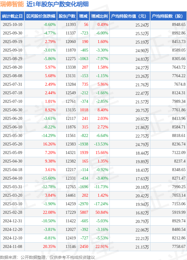 从股价来看,2025年9月30日至2025年10月10日,瑞德智能区间跌幅为0.6%,在此期间股东户数增加56.0户,增幅为0.49%。