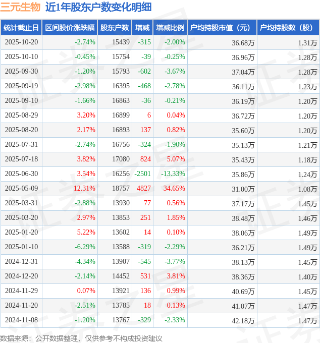 从股价来看,2025年10月10日至2025年10月20日,三元生物区间跌幅为2.74%,在此期间股东户数减少315.0户,减幅为2.0%。