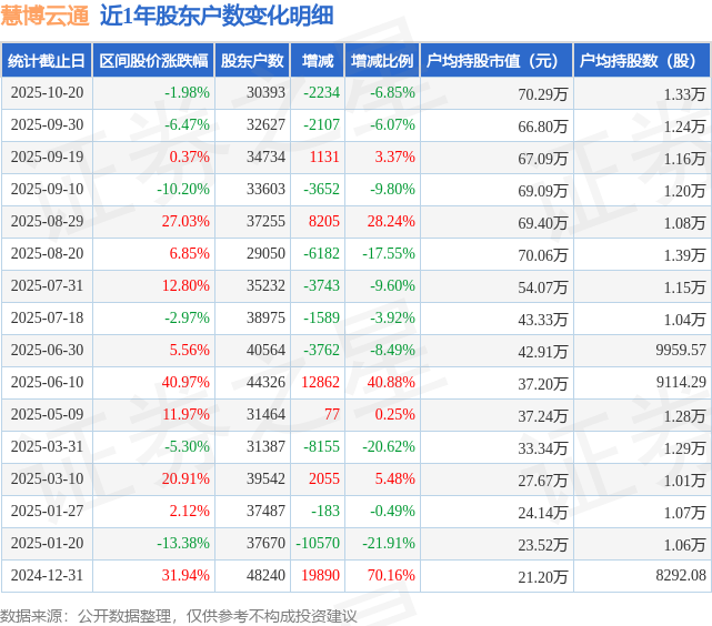 从股价来看,2025年9月30日至2025年10月20日,慧博云通区间跌幅为1.98%,在此期间股东户数减少2234.0户,减幅为6.85%。