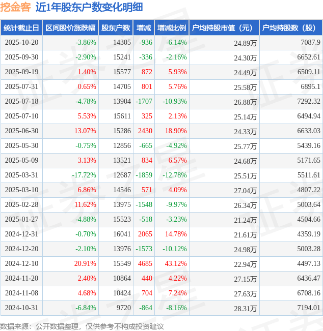 从股价来看,2025年9月30日至2025年10月20日,挖金客区间跌幅为3.86%,在此期间股东户数减少936.0户,减幅为6.14%。