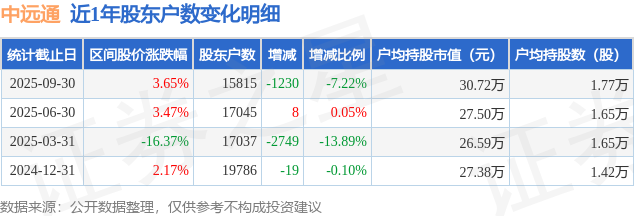 从股价来看,2025年6月30日至2025年9月30日,中远通区间涨幅为3.65%,在此期间股东户数减少1230.0户,减幅为7.22%。