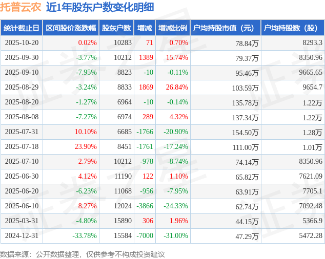 从股价来看,2025年9月30日至2025年10月20日,托普云农区间涨幅为0.02%,在此期间股东户数增加71.0户,增幅为0.7%。