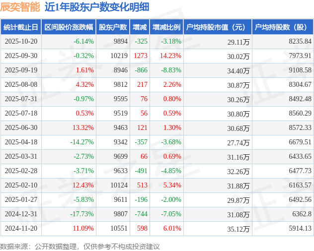 从股价来看,2025年9月30日至2025年10月20日,辰奕智能区间跌幅为6.14%,在此期间股东户数减少325.0户,减幅为3.18%。