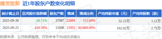 从股价来看,2025年9月25日至2025年9月30日,建发致新区间跌幅为20.71%,在此期间股东户数增加2.29万户,增幅为151.6%。