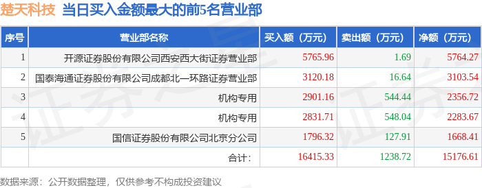 证券之星消息,沪深交易所2025年10月28日公布的交易公开信息显示,楚天科技(300358)因日涨幅达到15%的前5只证券登上龙虎榜。此次是近5个交易日内第1次上榜。