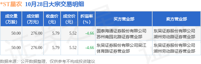证券之星消息,10月28日*ST星农发生大宗交易,交易数据如下: