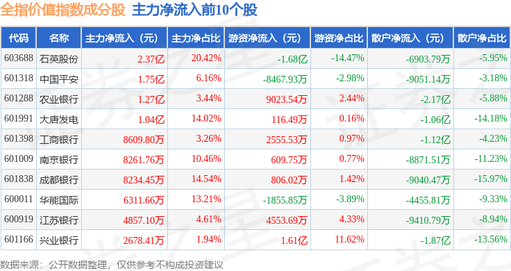 资金流向方面,全指价值(000058)指数成份股当日主力资金净流出合计64.91亿元,游资资金净流入合计33.9亿元,散户资金净流入合计31.02亿元。成份股资金流向详情见下表: