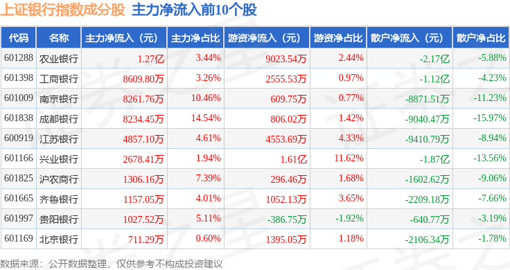 资金流向方面,上证银行(000134)指数成份股当日主力资金净流出合计5.86亿元,游资资金净流入合计11.07亿元,散户资金净流出合计5.21亿元。成份股资金流向详情见下表: