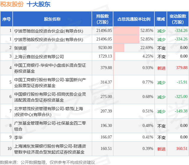 证券之星消息,10月28日税友股份发布公告《税友股份:股东减持股份计划时间届满暨减持股份结果公告》,其股东宁波思驰创业投资合伙企业(有限合伙)于2025年8月21日至2025年10月27日间合计减持254.43万股,占公司目前总股本的0.6261%,变动期间该股股价下跌15.19%,截止10月27日收盘报45.29元。