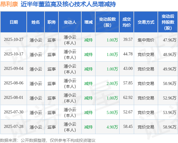 昂利康近半年内的董监高及核心技术人员增减持详情如下: