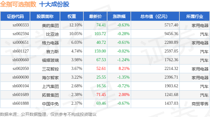 证券之星消息,10月28日,全指可选(000989)指数报收于5583.84点,跌0.04%,成交834.61亿元,换手率1.57%。当日该指数成份股中,上涨的有45家,三花智控以8.21%的涨幅领涨,下跌的有65家,威迈斯以8.04%的跌幅领跌。