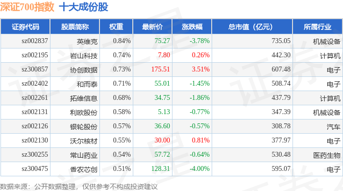 证券之星消息,10月28日,深证700(399010)指数报收于8589.52点,跌0.14%,成交3390.88亿元,换手率3.08%。当日该指数成份股中,上涨的有288家,理邦仪器以15.45%的涨幅领涨,下跌的有388家,合肥城建以10.01%的跌幅领跌。