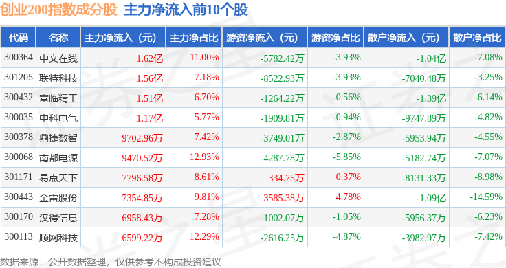 资金流向方面,创业200(399019)指数成份股当日主力资金净流出合计22.84亿元,游资资金净流入合计1265.46万元,散户资金净流入合计22.71亿元。成份股资金流向详情见下表: