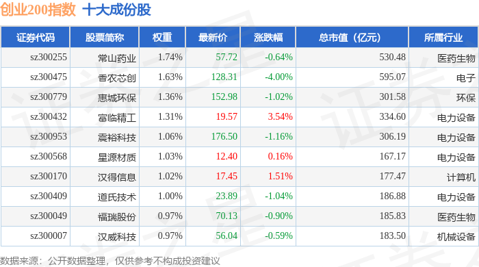 证券之星消息,10月28日,创业200(399019)指数报收于4438.39点,跌0.01%,成交1074.32亿元,换手率3.59%。当日该指数成份股中,上涨的有93家,理邦仪器以15.45%的涨幅领涨,下跌的有102家,正丹股份以8.08%的跌幅领跌。