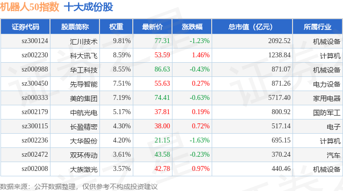 证券之星消息,10月28日,机器人50(399283)指数报收于4453.65点,跌0.08%,成交543.03亿元,换手率3.28%。当日该指数成份股中,上涨的有24家,航天智装以5.69%的涨幅领涨,下跌的有26家,科大智能以6.07%的跌幅领跌。
