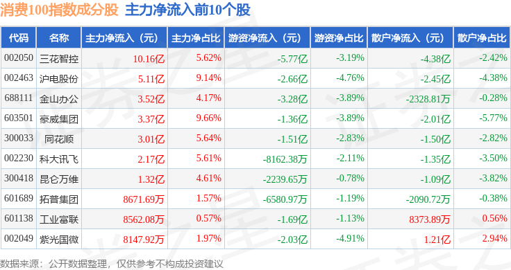 资金流向方面,消费100(399364)指数成份股当日主力资金净流出合计117.39亿元,游资资金净流入合计47.87亿元,散户资金净流入合计69.53亿元。成份股资金流向详情见下表: