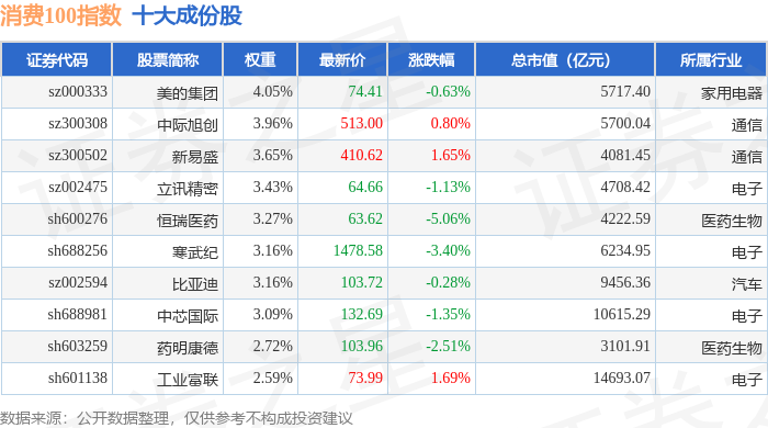 消费100(399364)指数十大成份股详情如下: